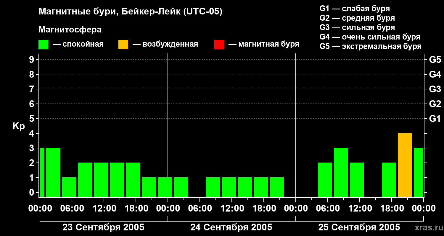 Изменения геомагнитного индекса Kp с 23 по 25 сентября 2005 года для средних широт