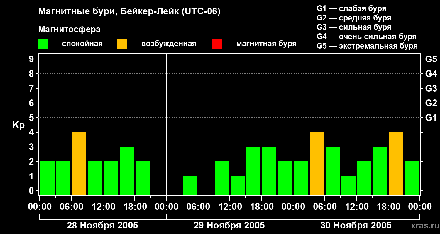 Изменения геомагнитного индекса Kp с 28 по 30 ноября 2005 года для средних широт