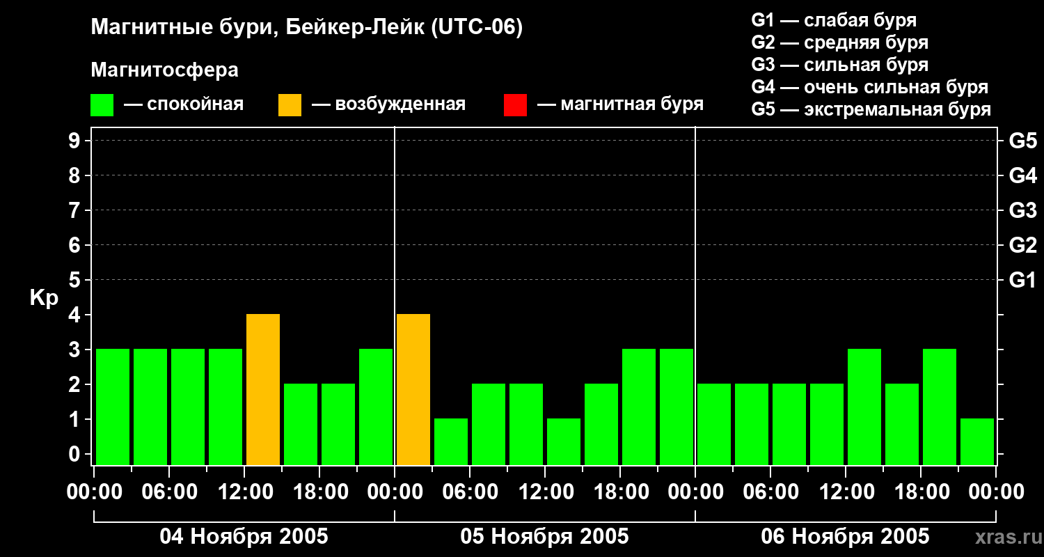 Изменения геомагнитного индекса Kp с 4 по 6 ноября 2005 года для средних широт