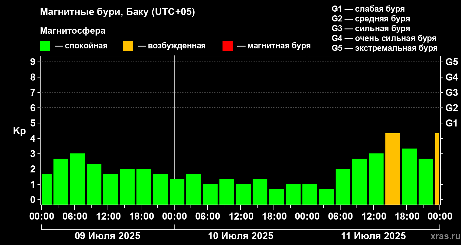 Изменения геомагнитного индекса Kp с 9 по 11 июля 2025 года для средних широт