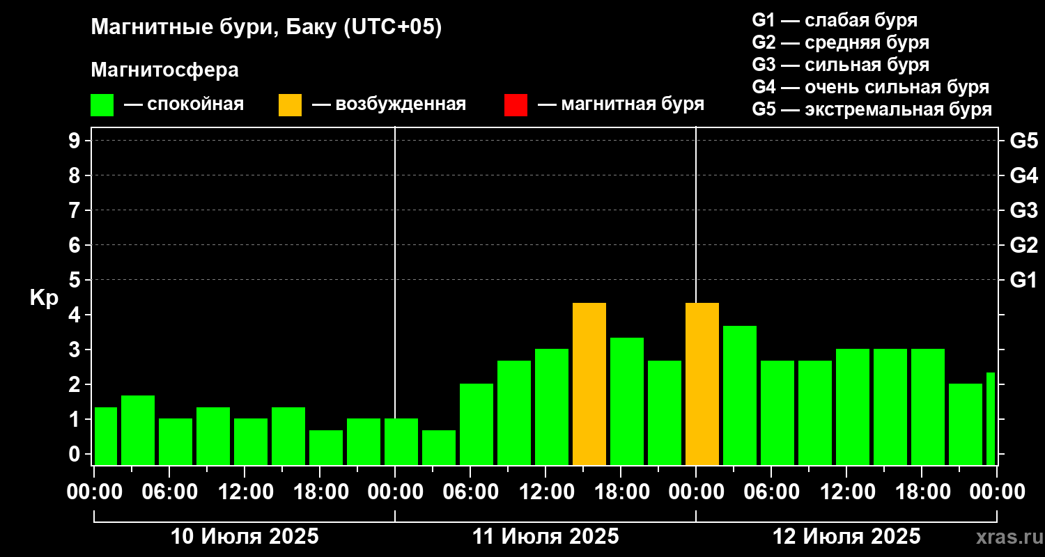 Изменения геомагнитного индекса Kp с 10 по 12 июля 2025 года для средних широт