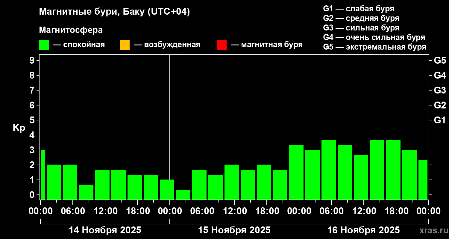 Изменения геомагнитного индекса Kp с 14 по 16 ноября 2025 года для средних широт