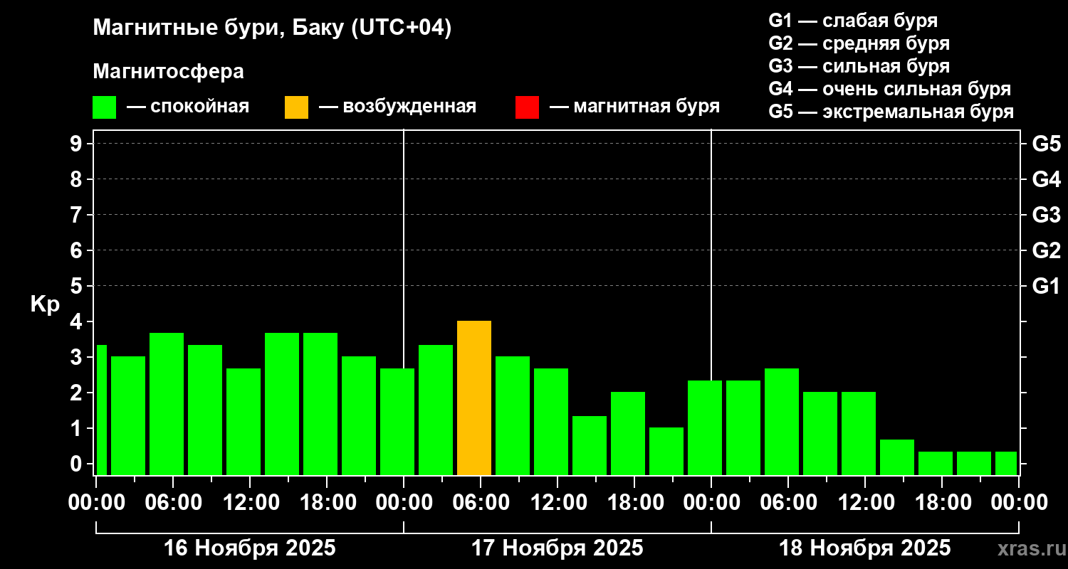Изменения геомагнитного индекса Kp с 16 по 18 ноября 2025 года для средних широт