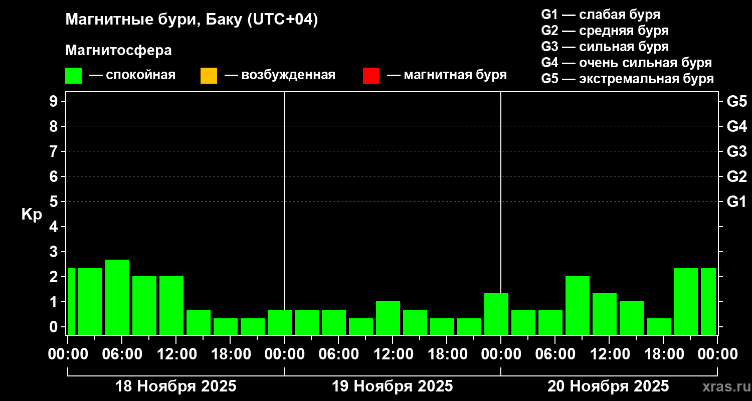 Изменения геомагнитного индекса Kp с 18 по 20 ноября 2025 года для средних широт