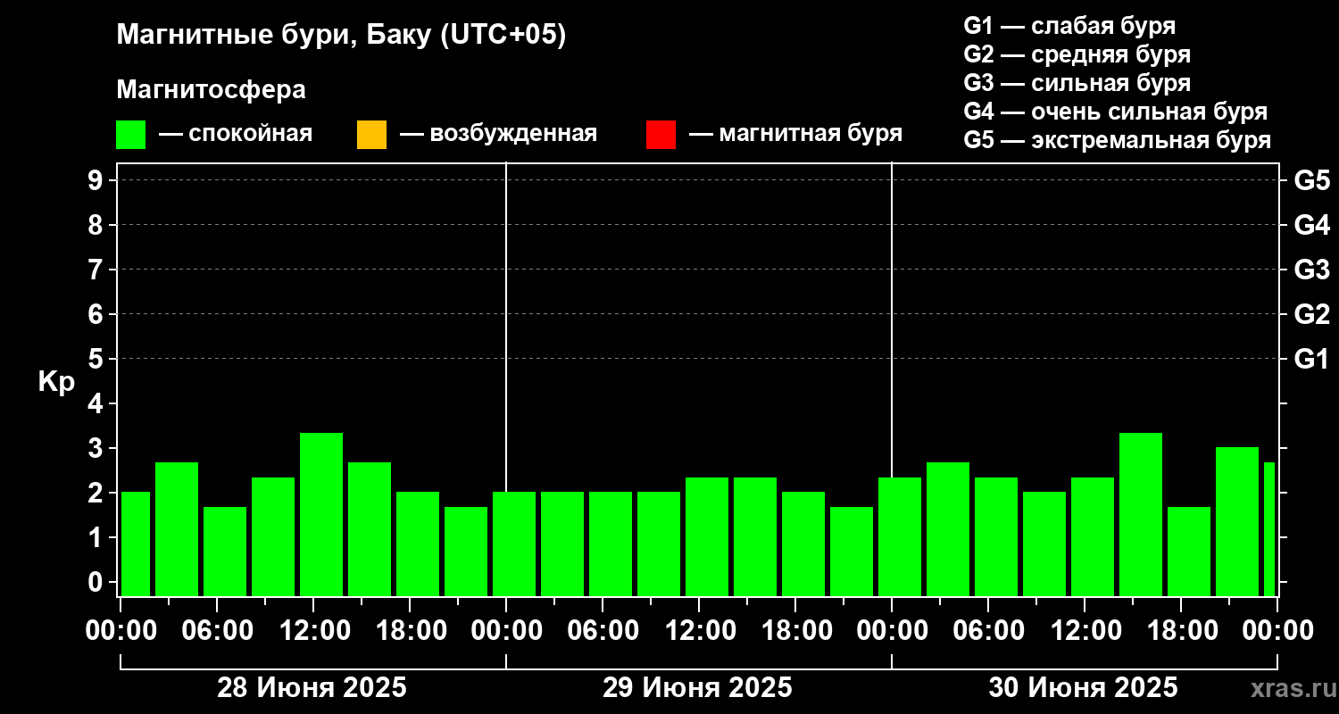 Изменения геомагнитного индекса Kp с 28 по 30 июня 2025 года для средних широт