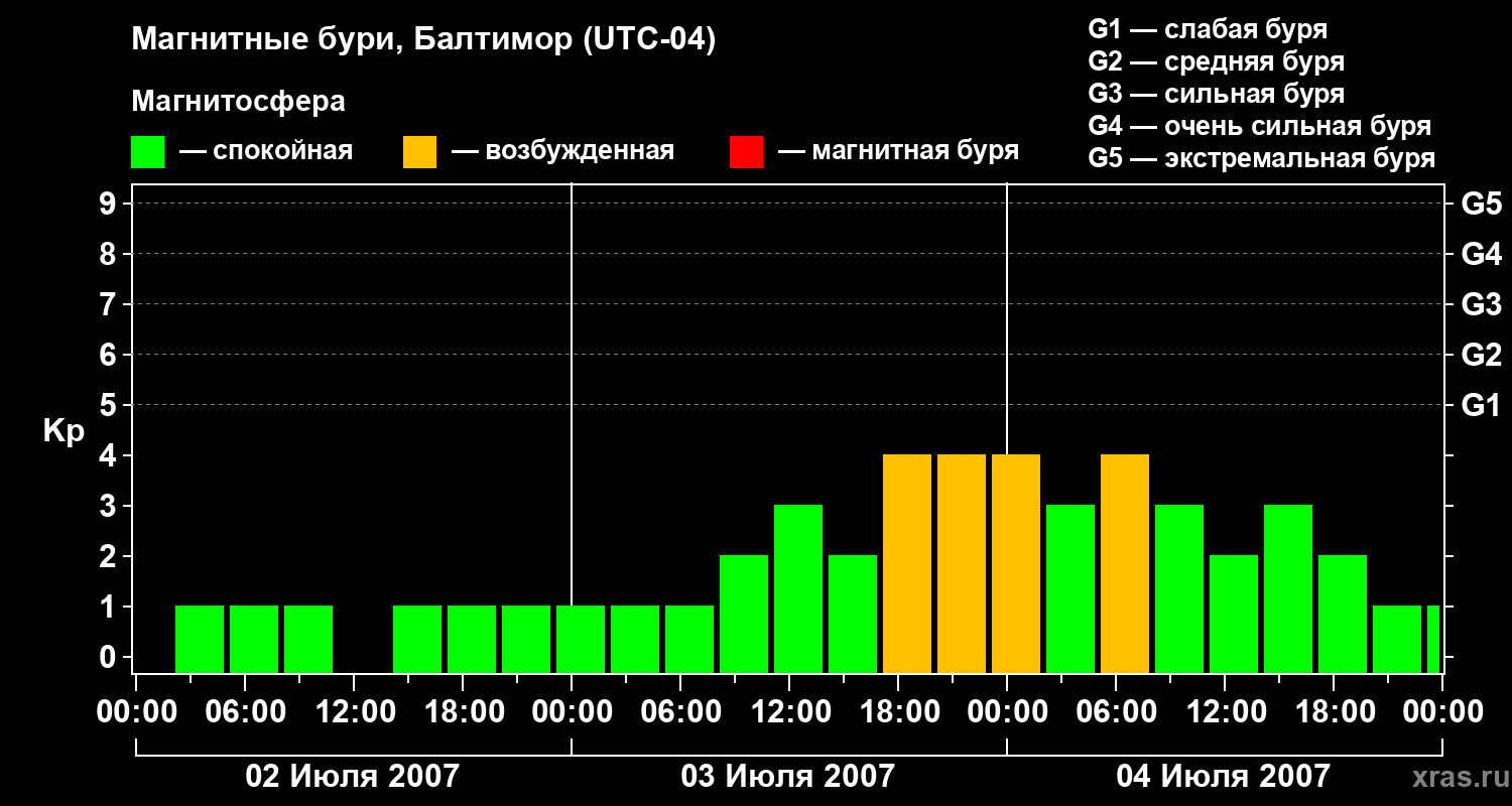 Изменения геомагнитного индекса Kp с 2 по 4 июля 2007 года для средних широт