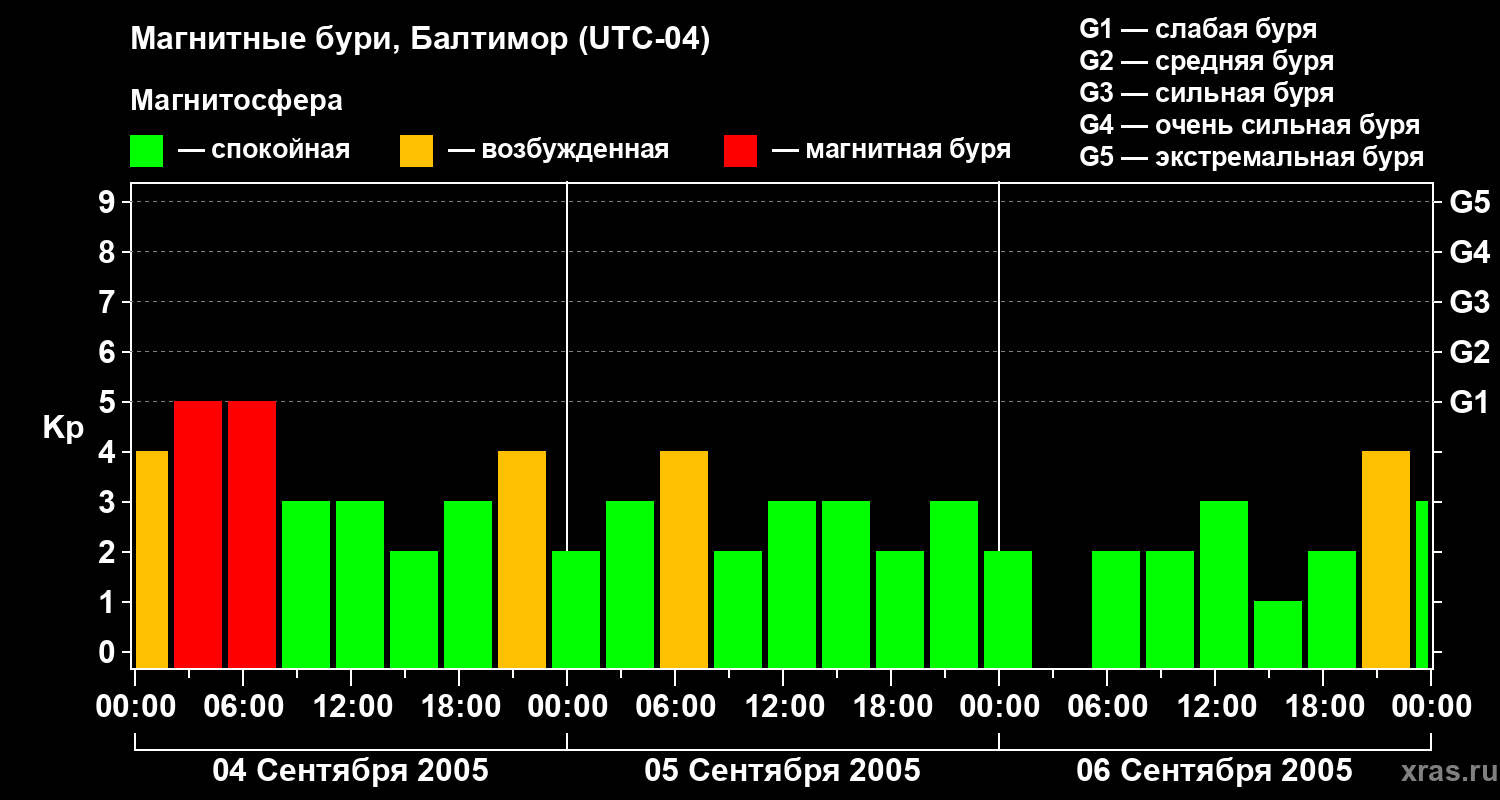 Изменения геомагнитного индекса Kp с 4 по 6 сентября 2005 года для средних широт