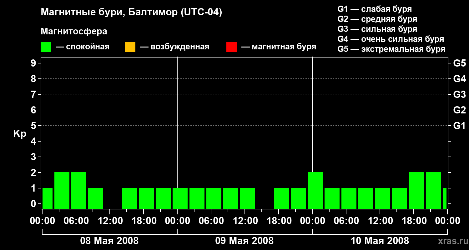 Изменения геомагнитного индекса Kp с 8 по 10 мая 2008 года для средних широт