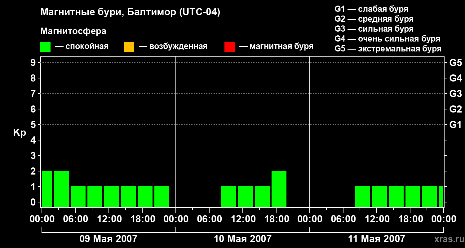 Изменения геомагнитного индекса Kp с 9 по 11 мая 2007 года для средних широт
