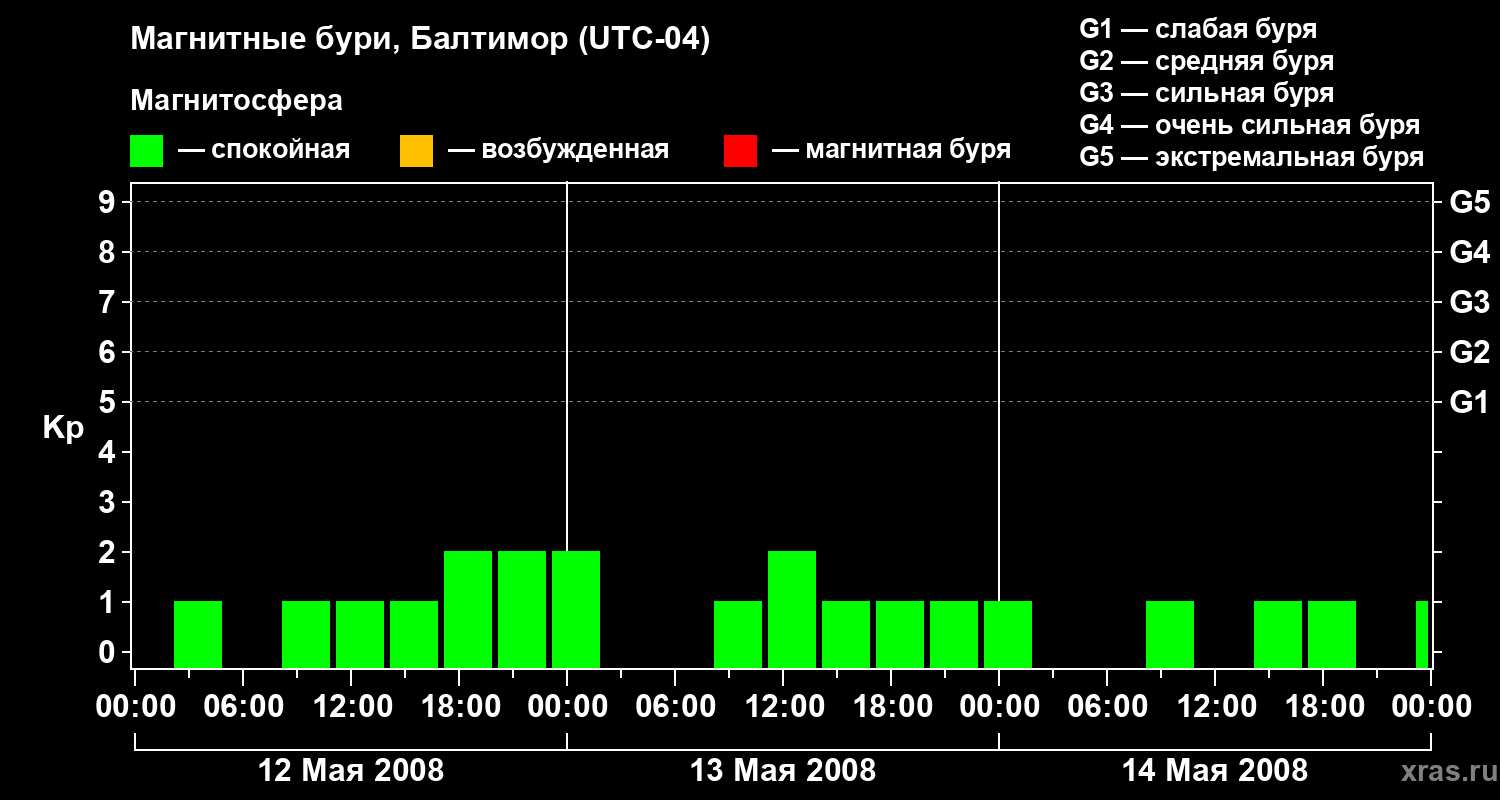 Изменения геомагнитного индекса Kp с 12 по 14 мая 2008 года для средних широт