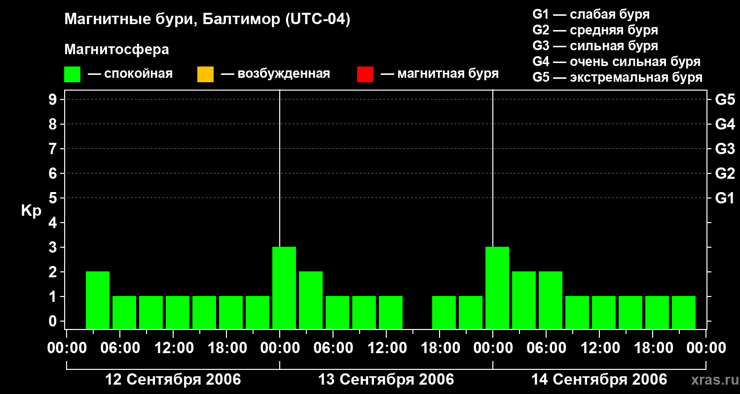 Изменения геомагнитного индекса Kp с 12 по 14 сентября 2006 года для средних широт