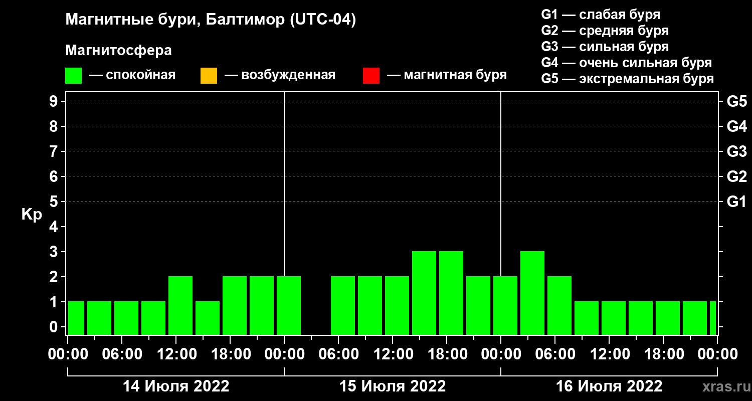 Изменения геомагнитного индекса Kp с 14 по 16 июля 2022 года для средних широт