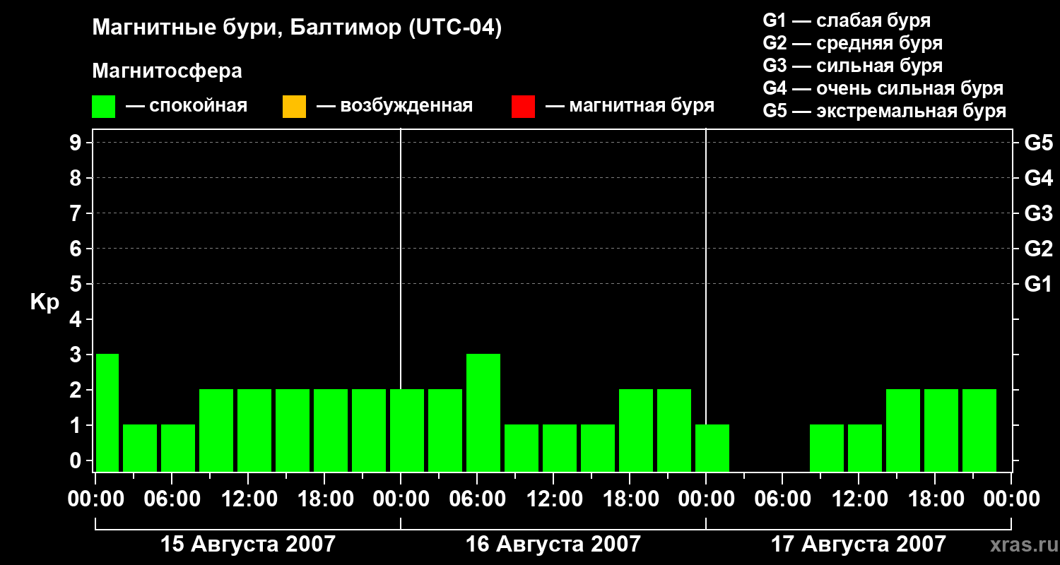 Изменения геомагнитного индекса Kp с 15 по 17 августа 2007 года для средних широт