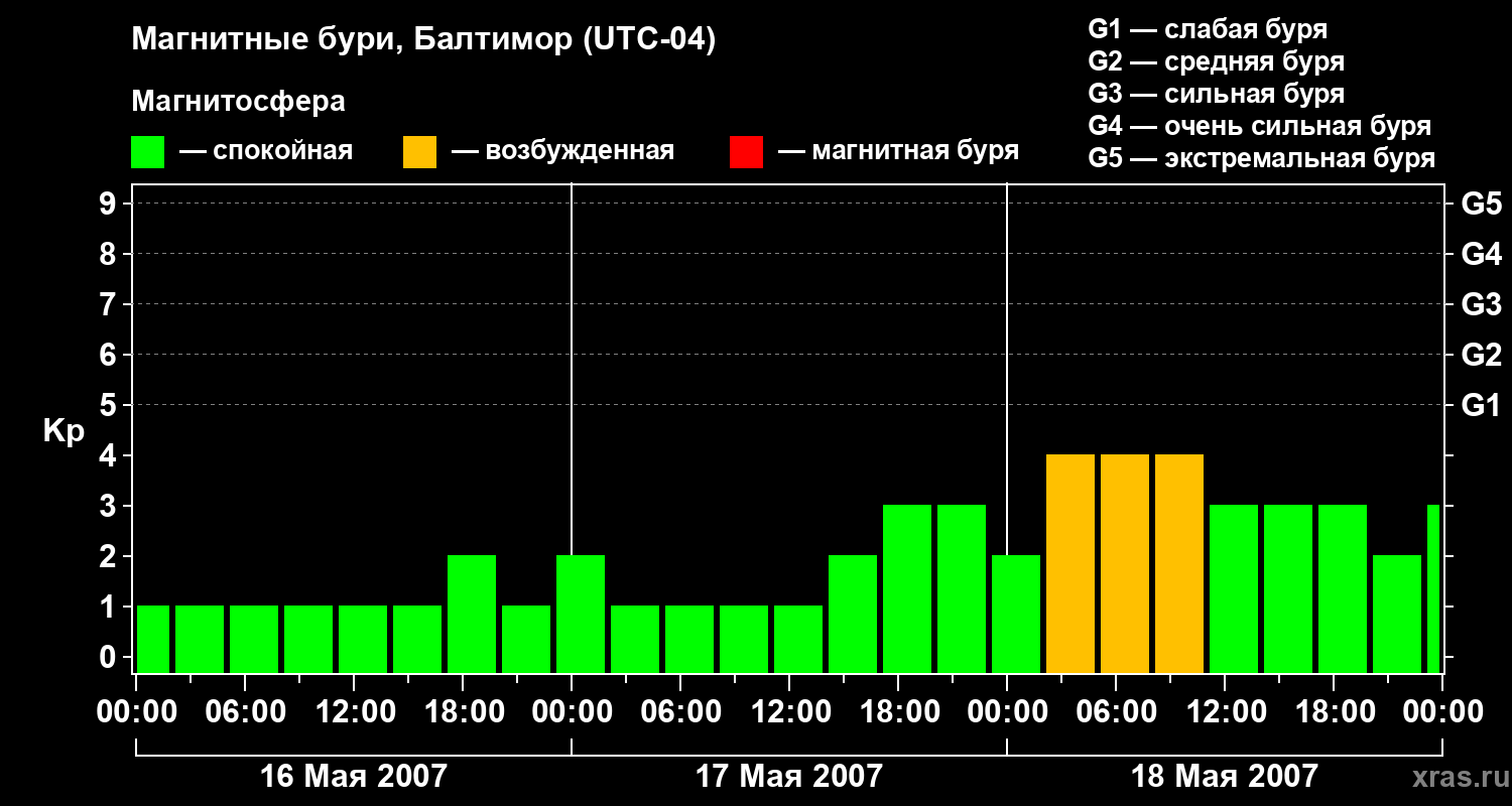 Изменения геомагнитного индекса Kp с 16 по 18 мая 2007 года для средних широт