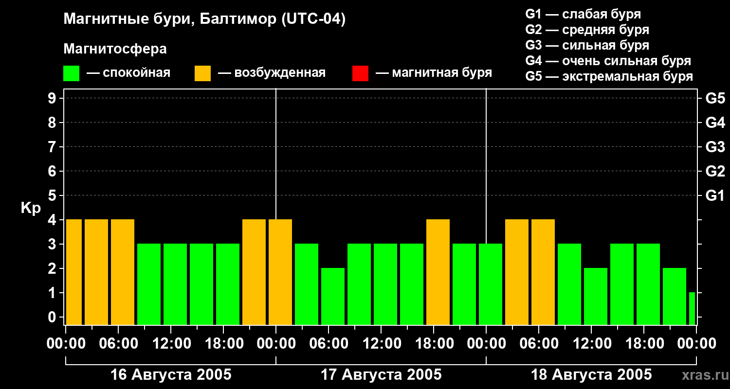 Изменения геомагнитного индекса Kp с 16 по 18 августа 2005 года для средних широт