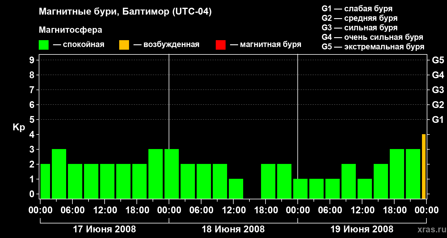 Изменения геомагнитного индекса Kp с 17 по 19 июня 2008 года для средних широт