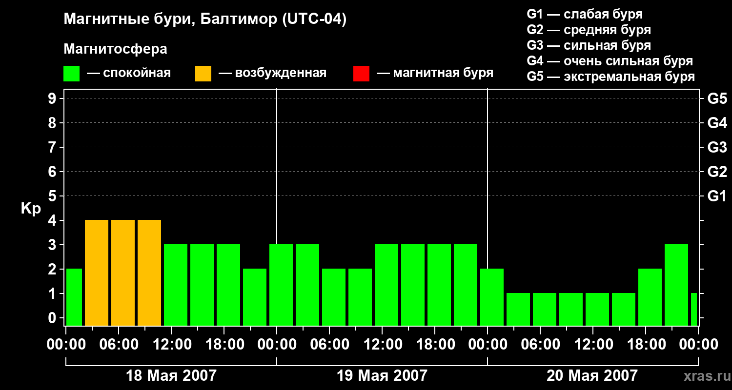 Изменения геомагнитного индекса Kp с 18 по 20 мая 2007 года для средних широт