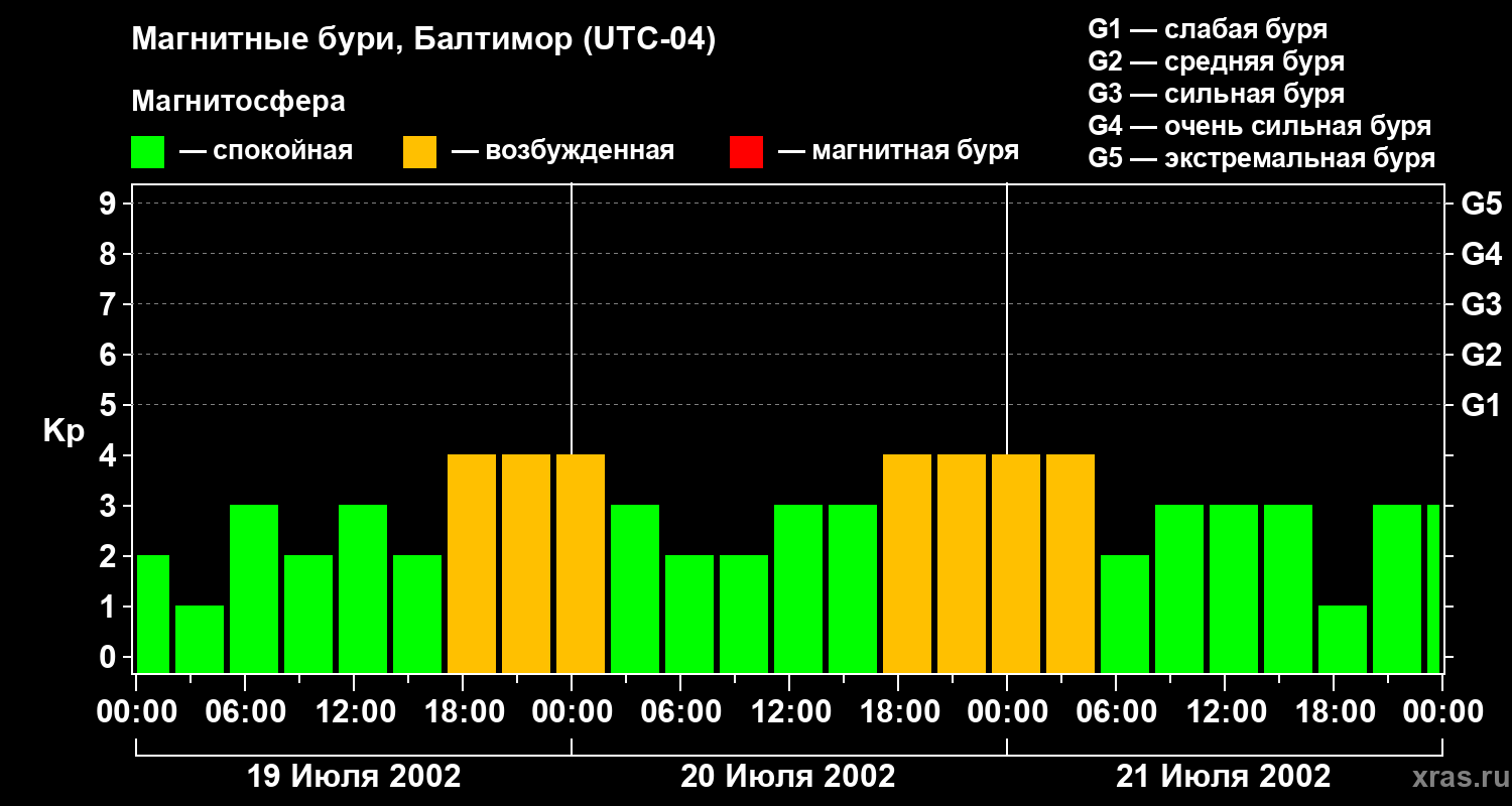 Изменения геомагнитного индекса Kp с 19 по 21 июля 2002 года для средних широт