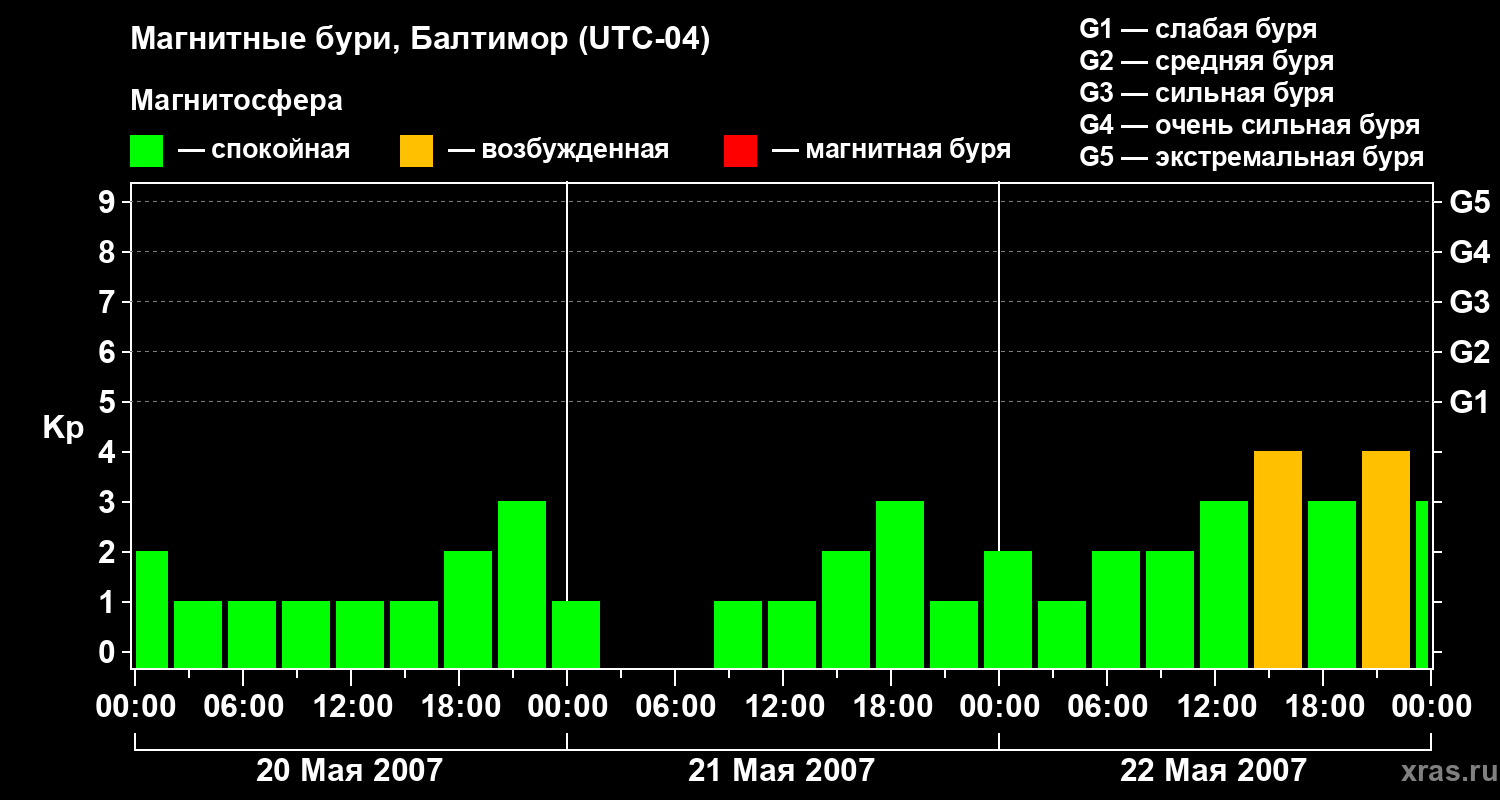 Изменения геомагнитного индекса Kp с 20 по 22 мая 2007 года для средних широт