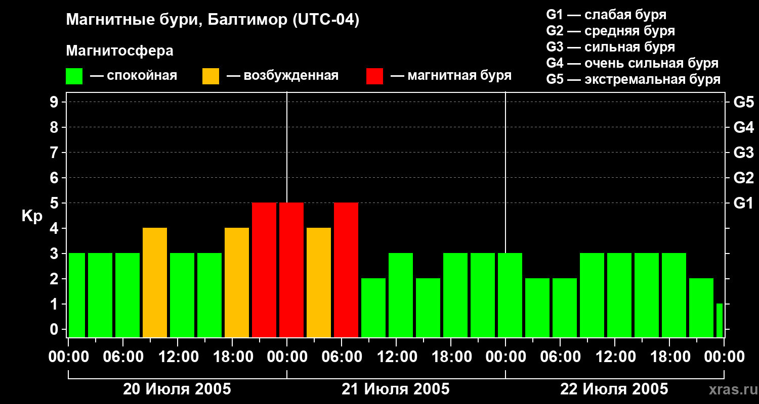 Изменения геомагнитного индекса Kp с 20 по 22 июля 2005 года для средних широт