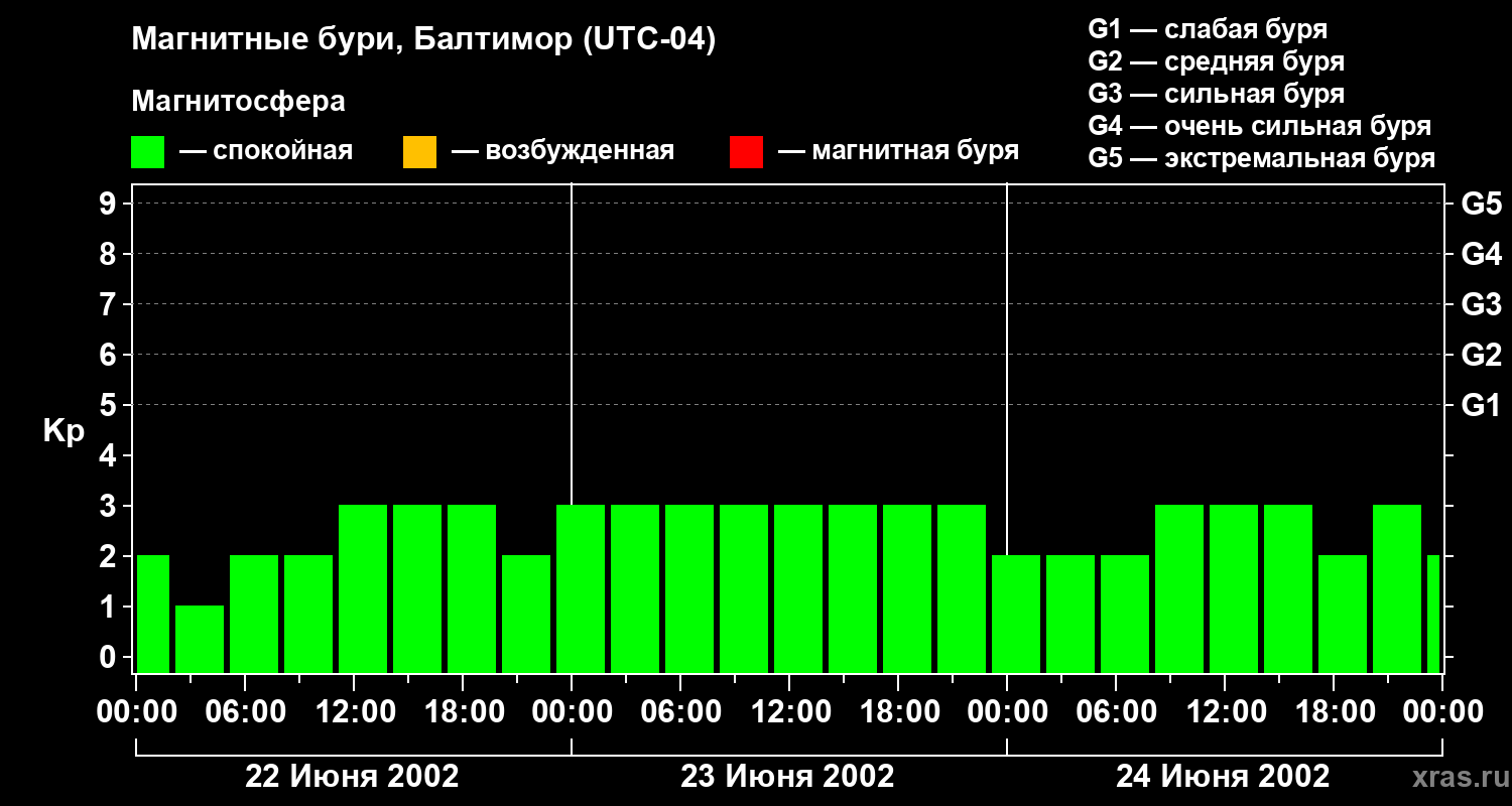 Изменения геомагнитного индекса Kp с 22 по 24 июня 2002 года для средних широт