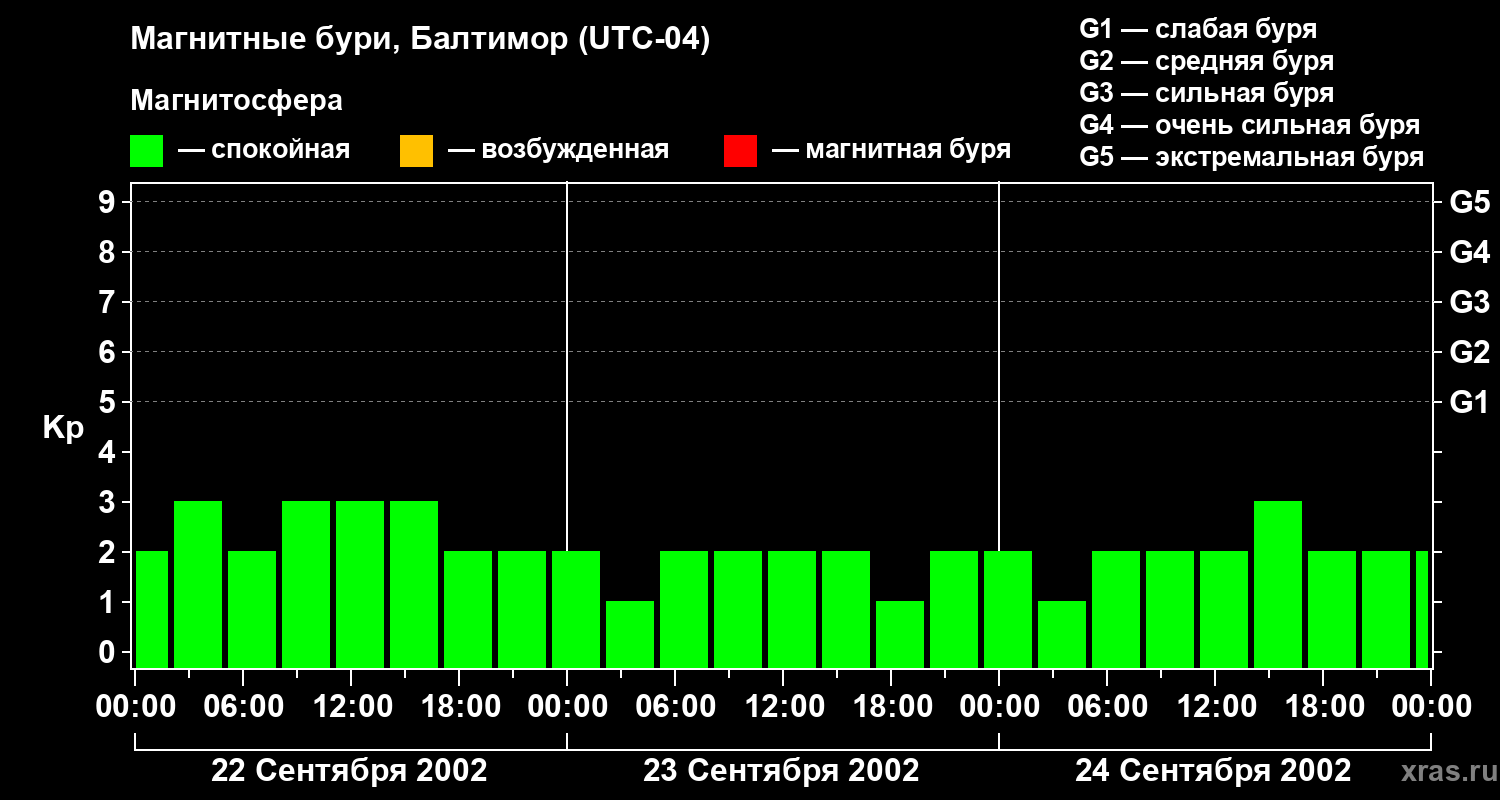 Изменения геомагнитного индекса Kp с 22 по 24 сентября 2002 года для средних широт