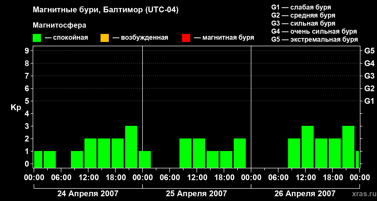 Изменения геомагнитного индекса Kp с 24 по 26 апреля 2007 года для средних широт