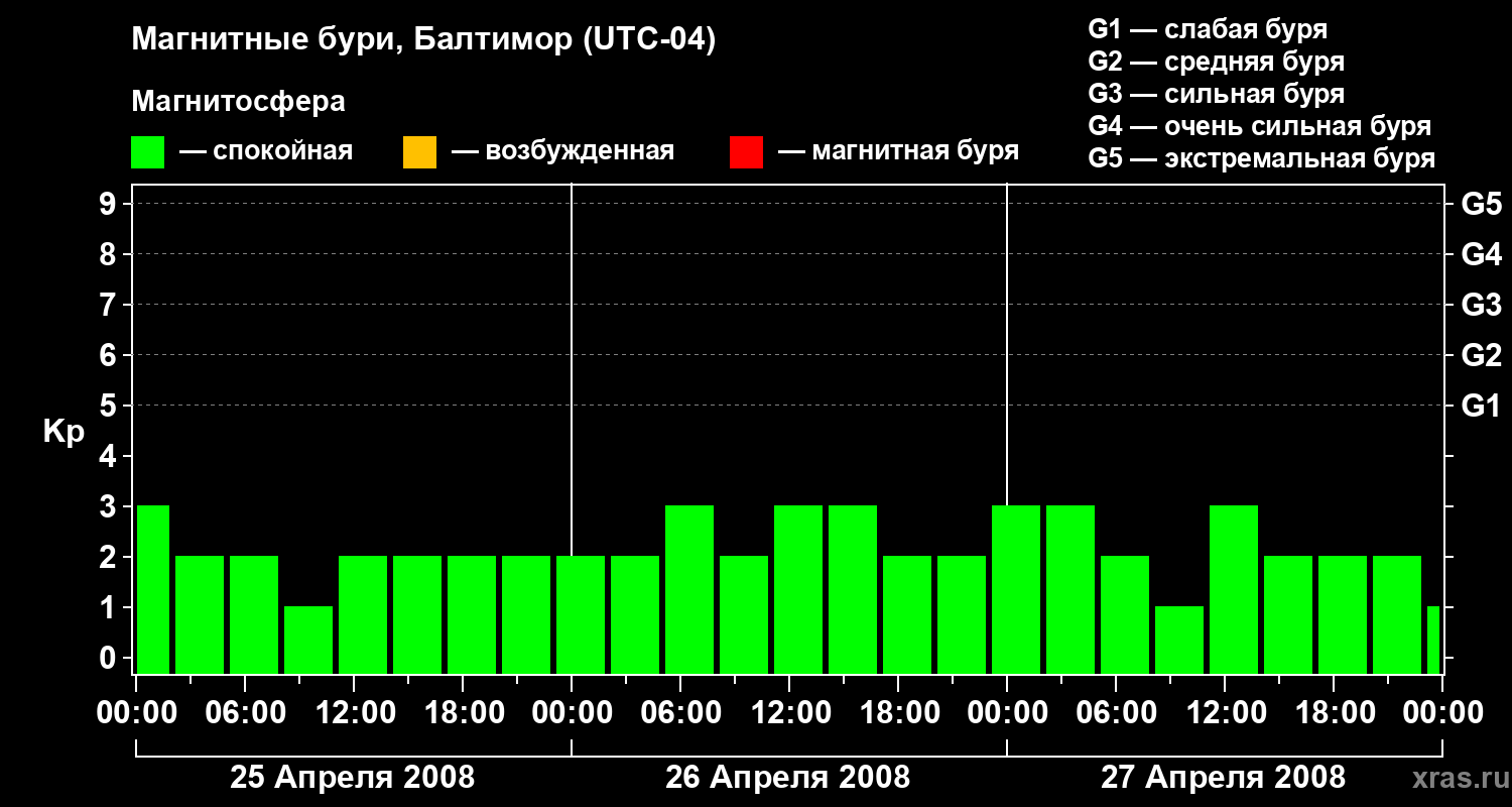 Изменения геомагнитного индекса Kp с 25 по 27 апреля 2008 года для средних широт