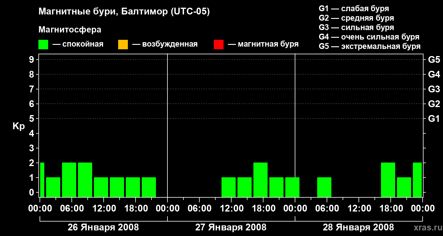 Изменения геомагнитного индекса Kp с 26 по 28 января 2008 года для средних широт