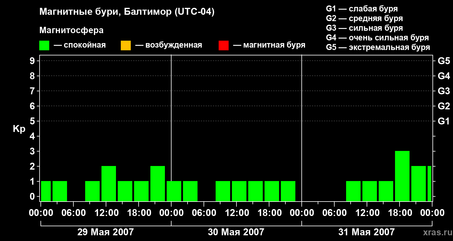 Изменения геомагнитного индекса Kp с 29 по 31 мая 2007 года для средних широт