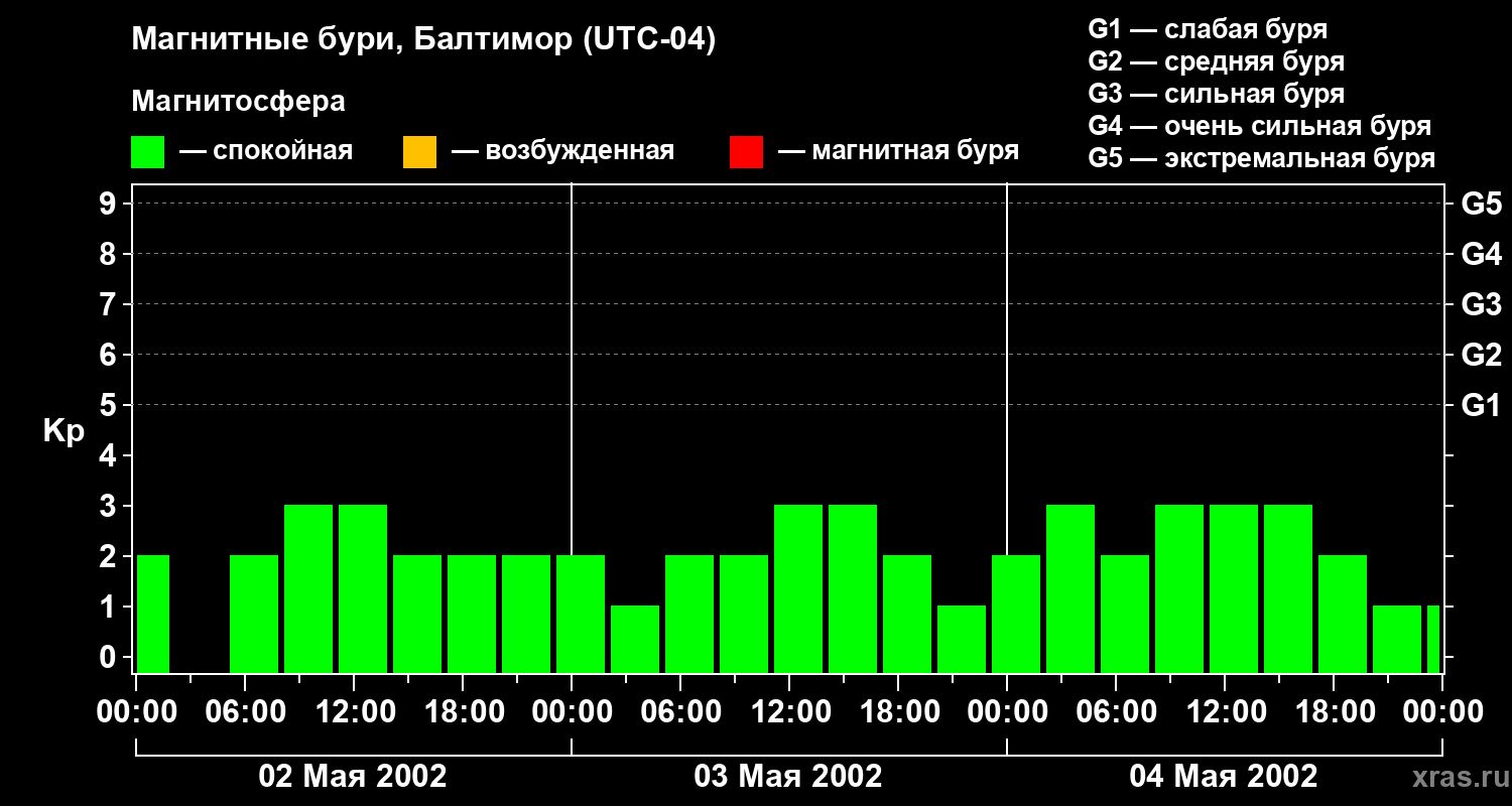 Изменения геомагнитного индекса Kp с 2 по 4 мая 2002 года для средних широт