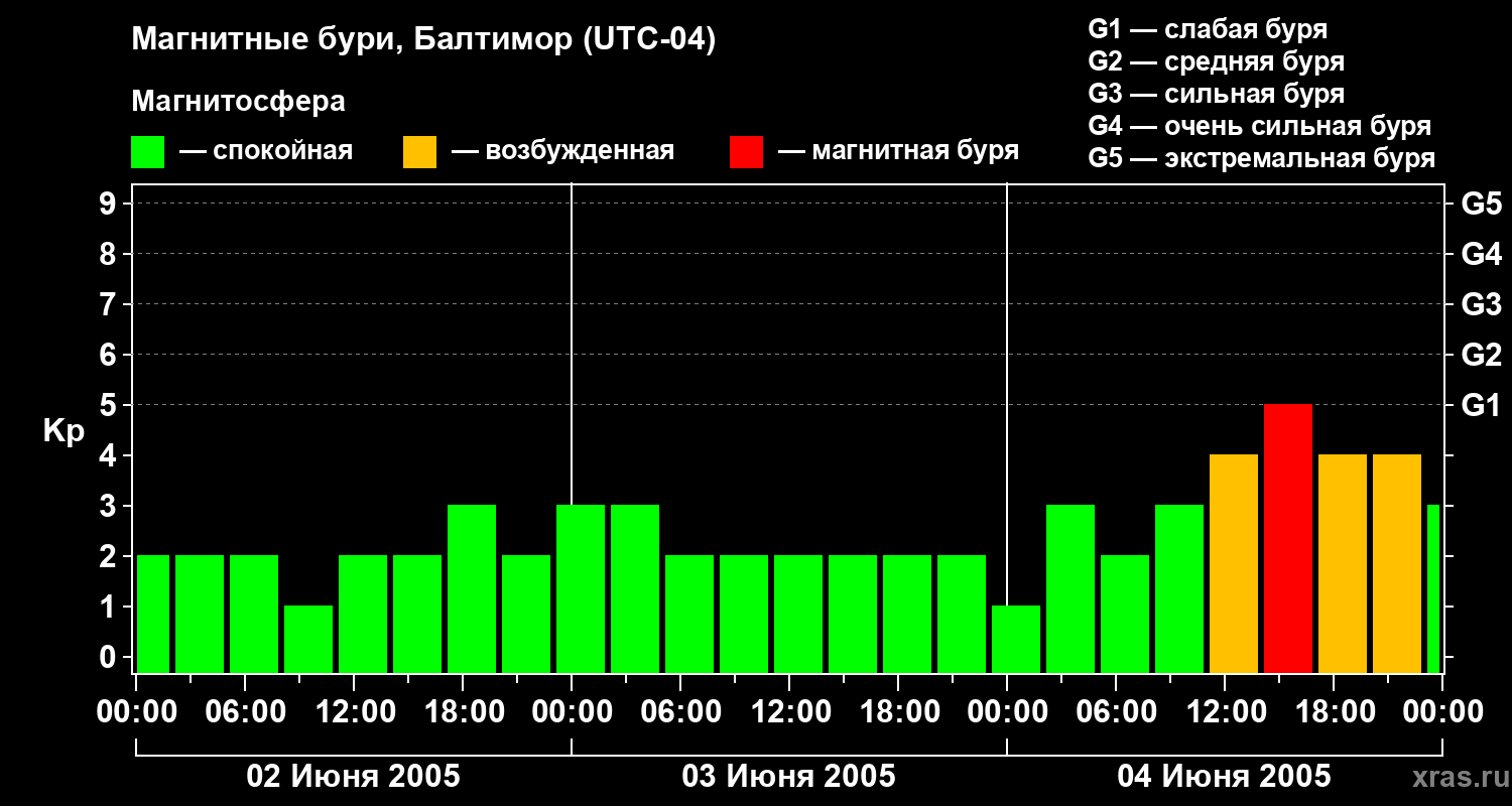 Изменения геомагнитного индекса Kp с 2 по 4 июня 2005 года для средних широт