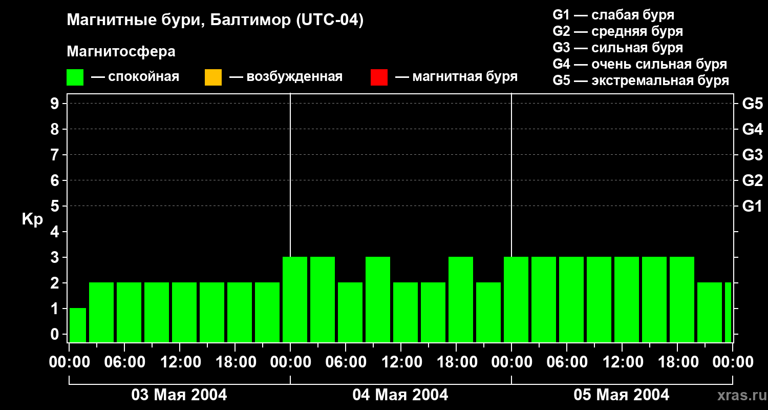 Изменения геомагнитного индекса Kp с 3 по 5 мая 2004 года для средних широт