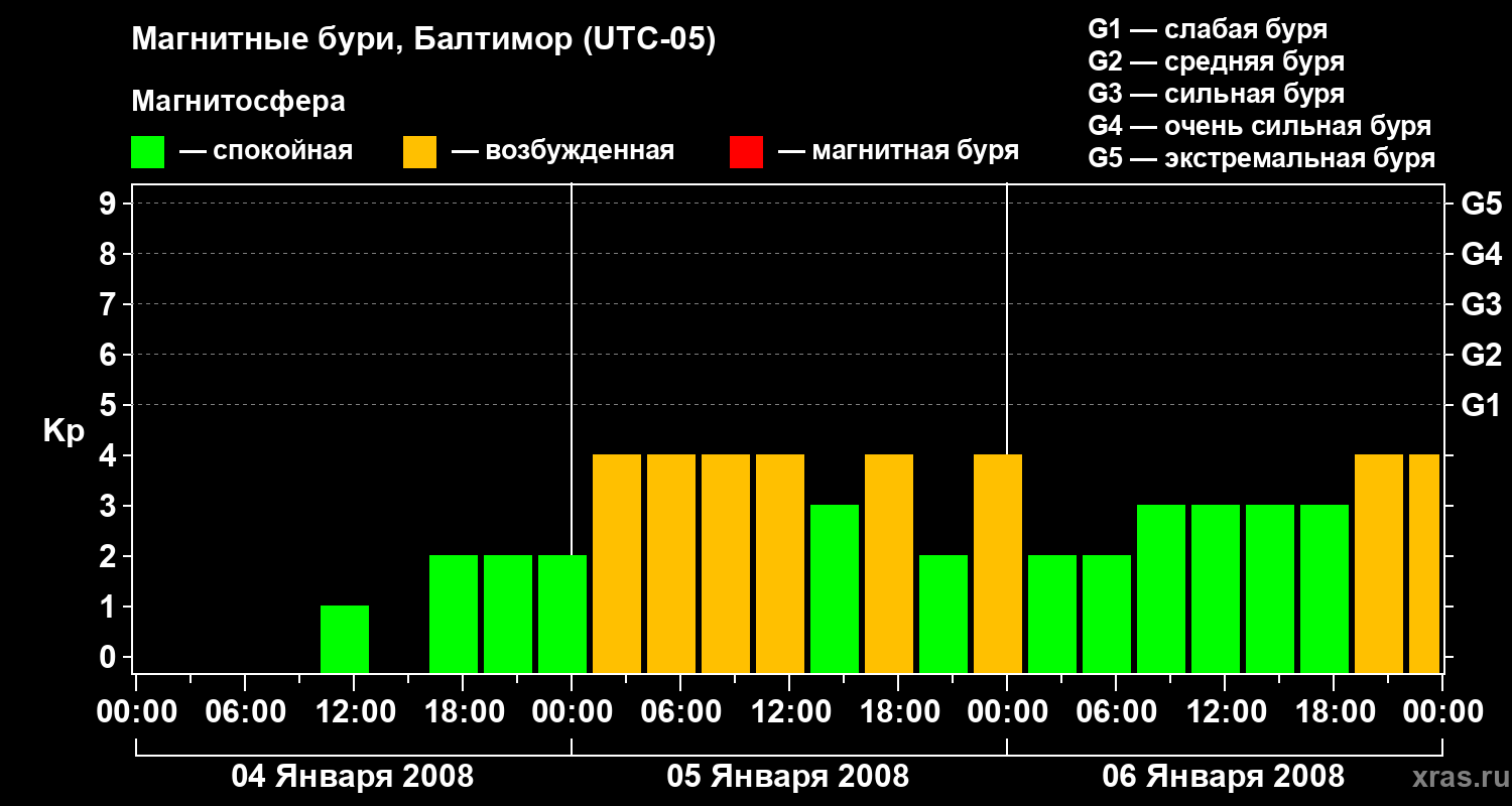 Изменения геомагнитного индекса Kp с 4 по 6 января 2008 года для средних широт
