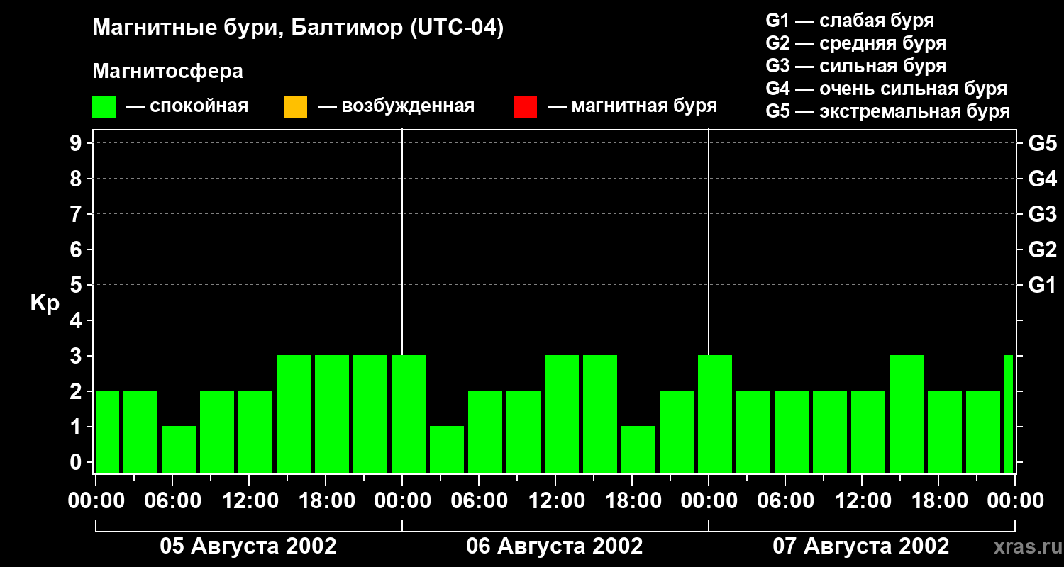 Изменения геомагнитного индекса Kp с 5 по 7 августа 2002 года для средних широт