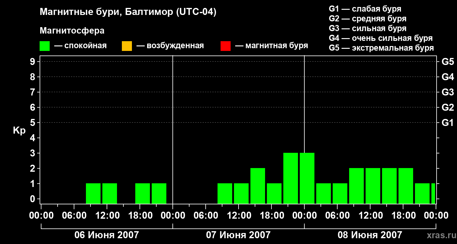 Изменения геомагнитного индекса Kp с 6 по 8 июня 2007 года для средних широт