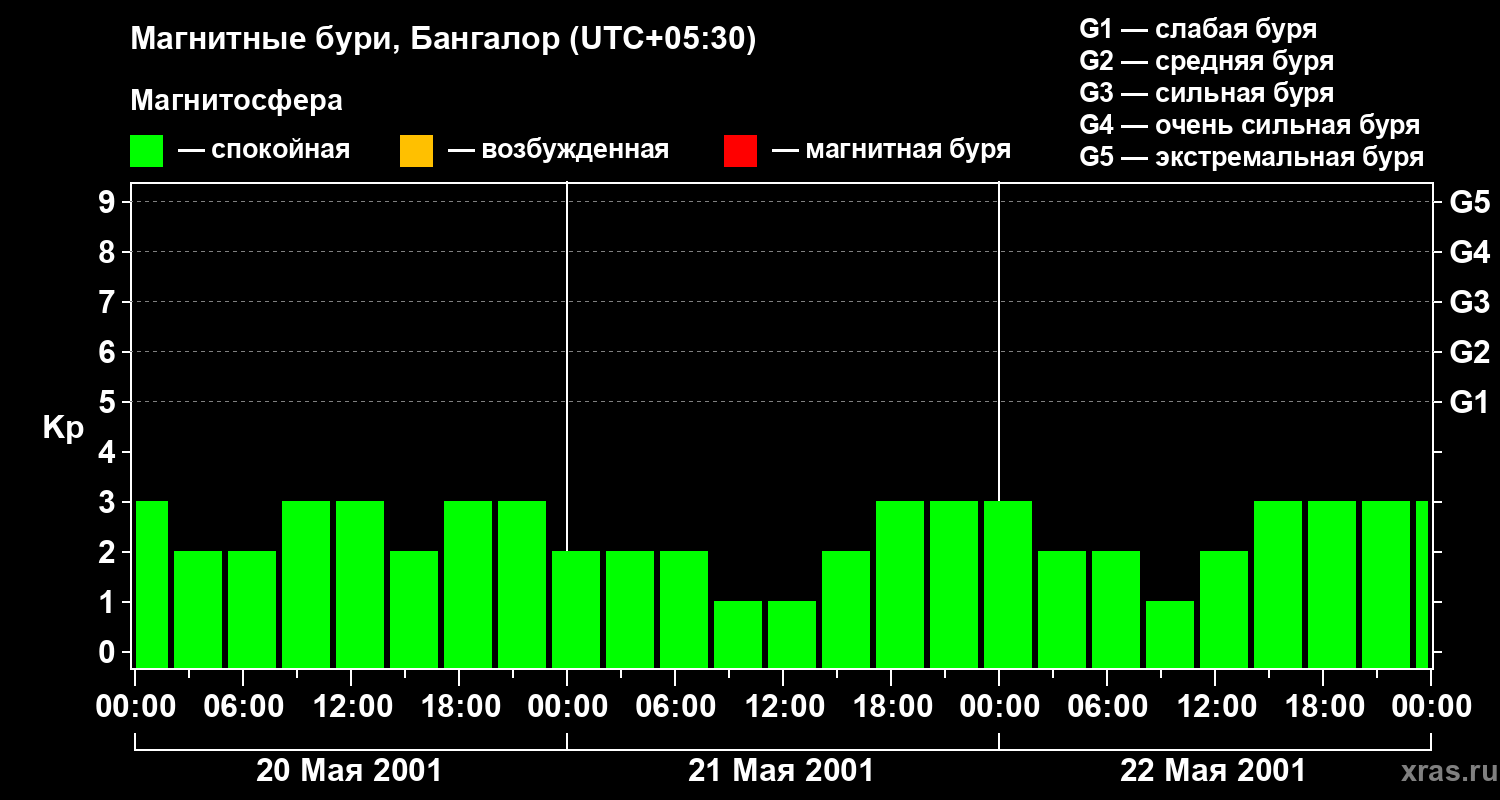 Изменения геомагнитного индекса Kp с 20 по 22 мая 2001 года для средних широт