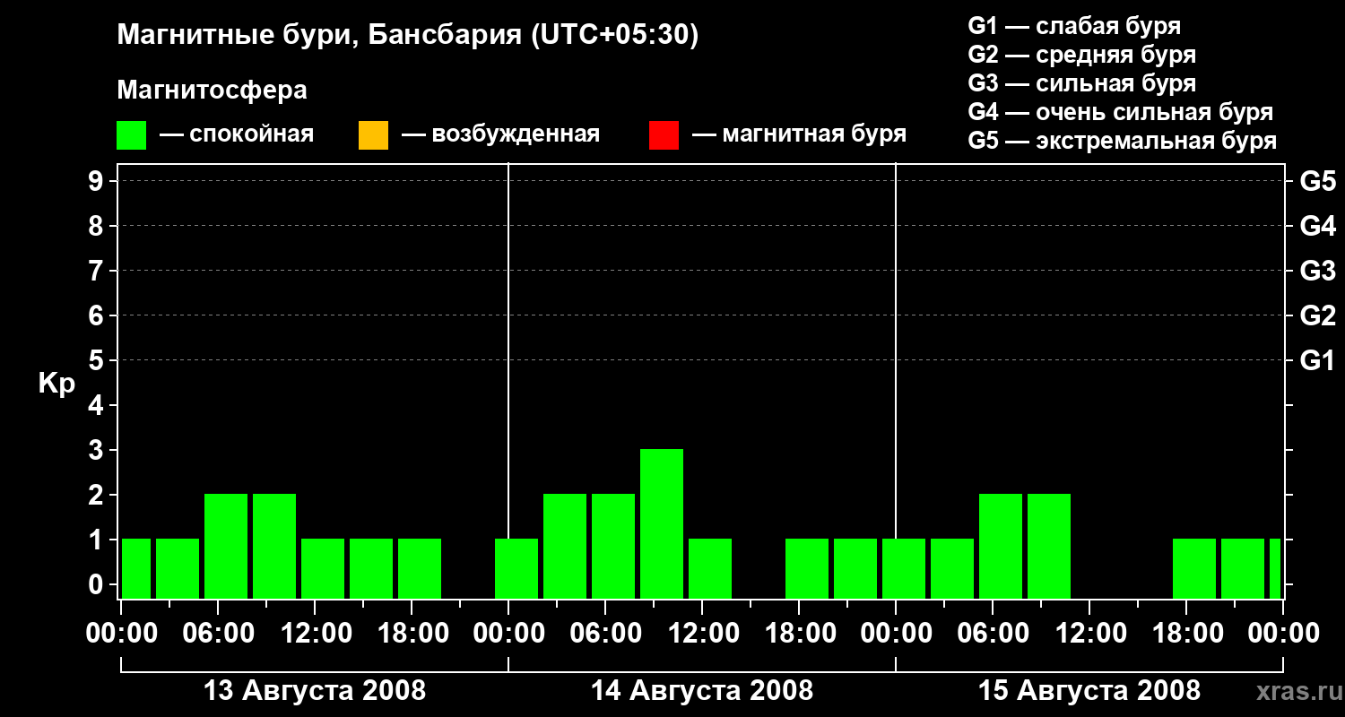 Изменения геомагнитного индекса Kp с 13 по 15 августа 2008 года для средних широт