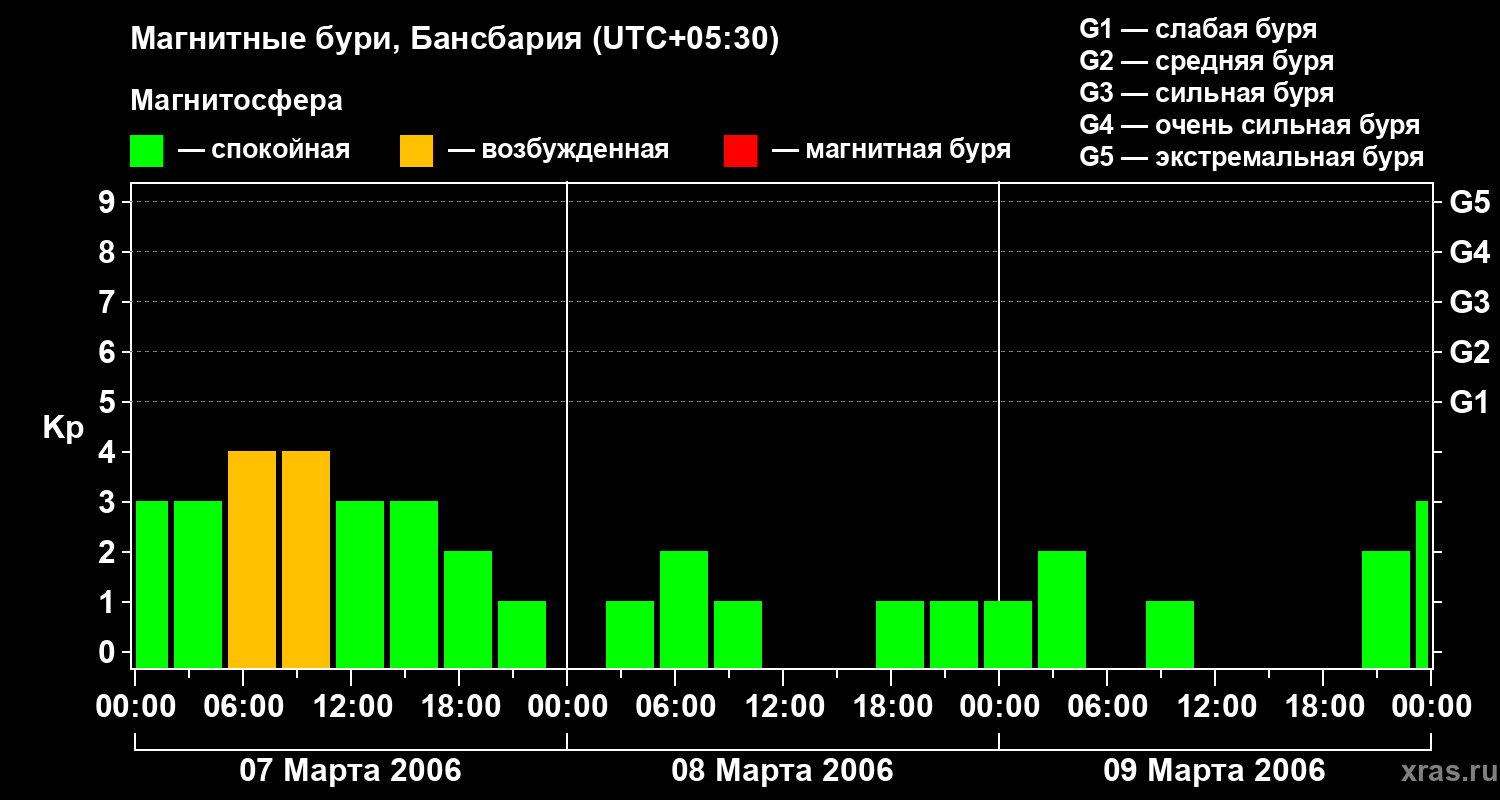 Изменения геомагнитного индекса Kp с 7 по 9 марта 2006 года для средних широт