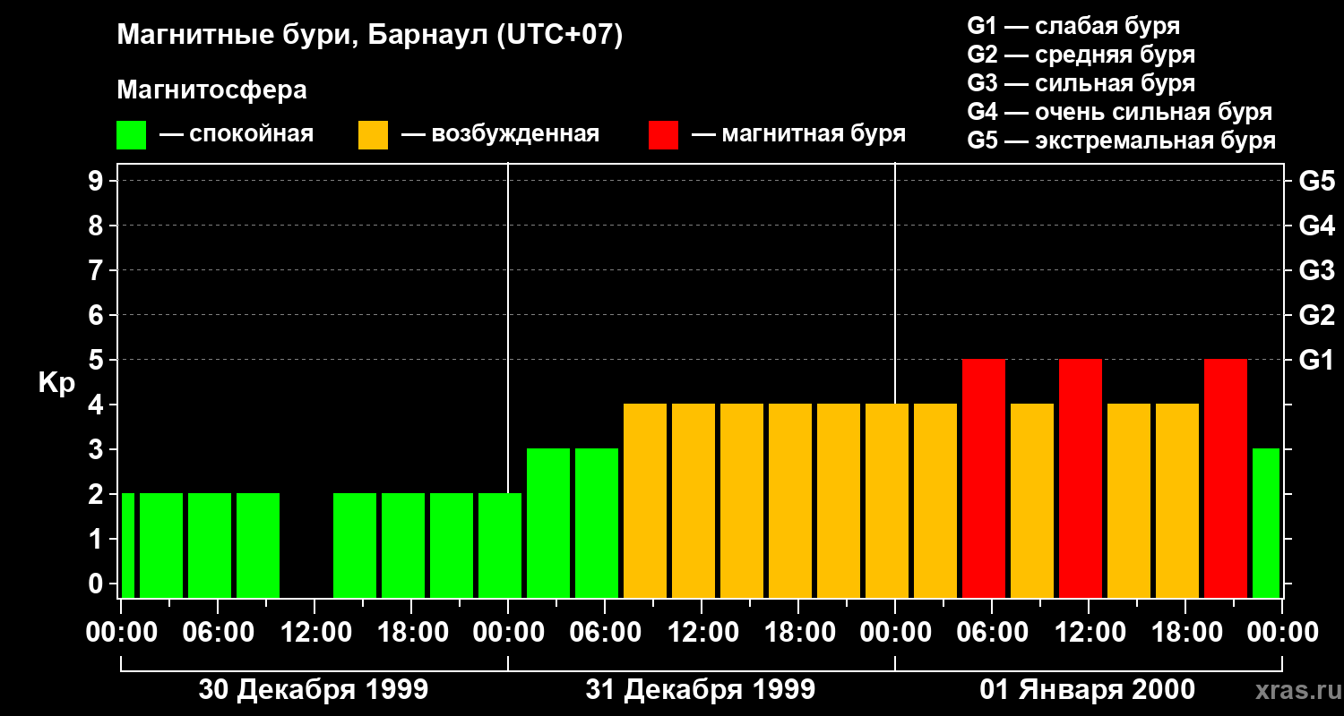 Изменения геомагнитного индекса Kp с 30 декабря 1999 года по 1 января 2000 года для средних широт