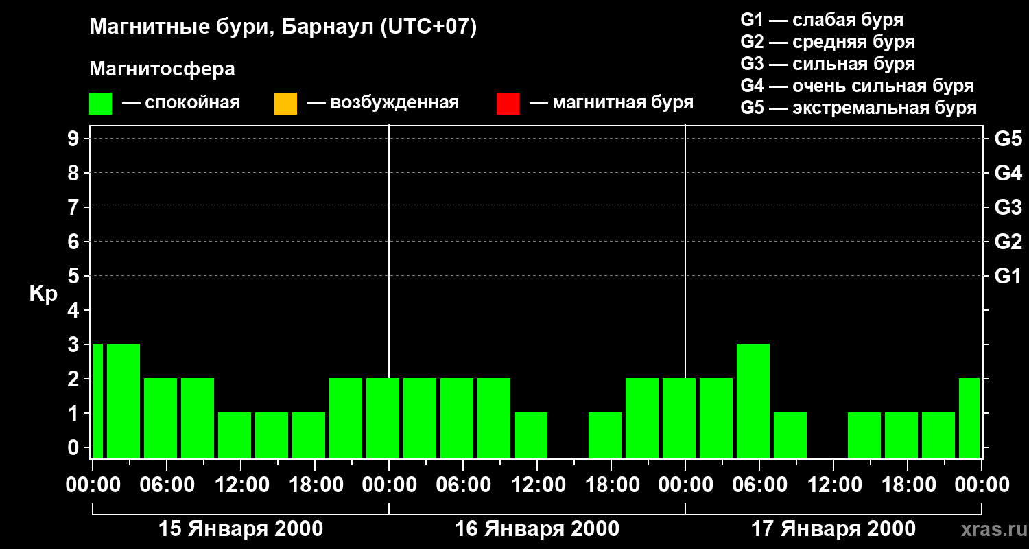 Изменения геомагнитного индекса Kp с 15 по 17 января 2000 года для средних широт