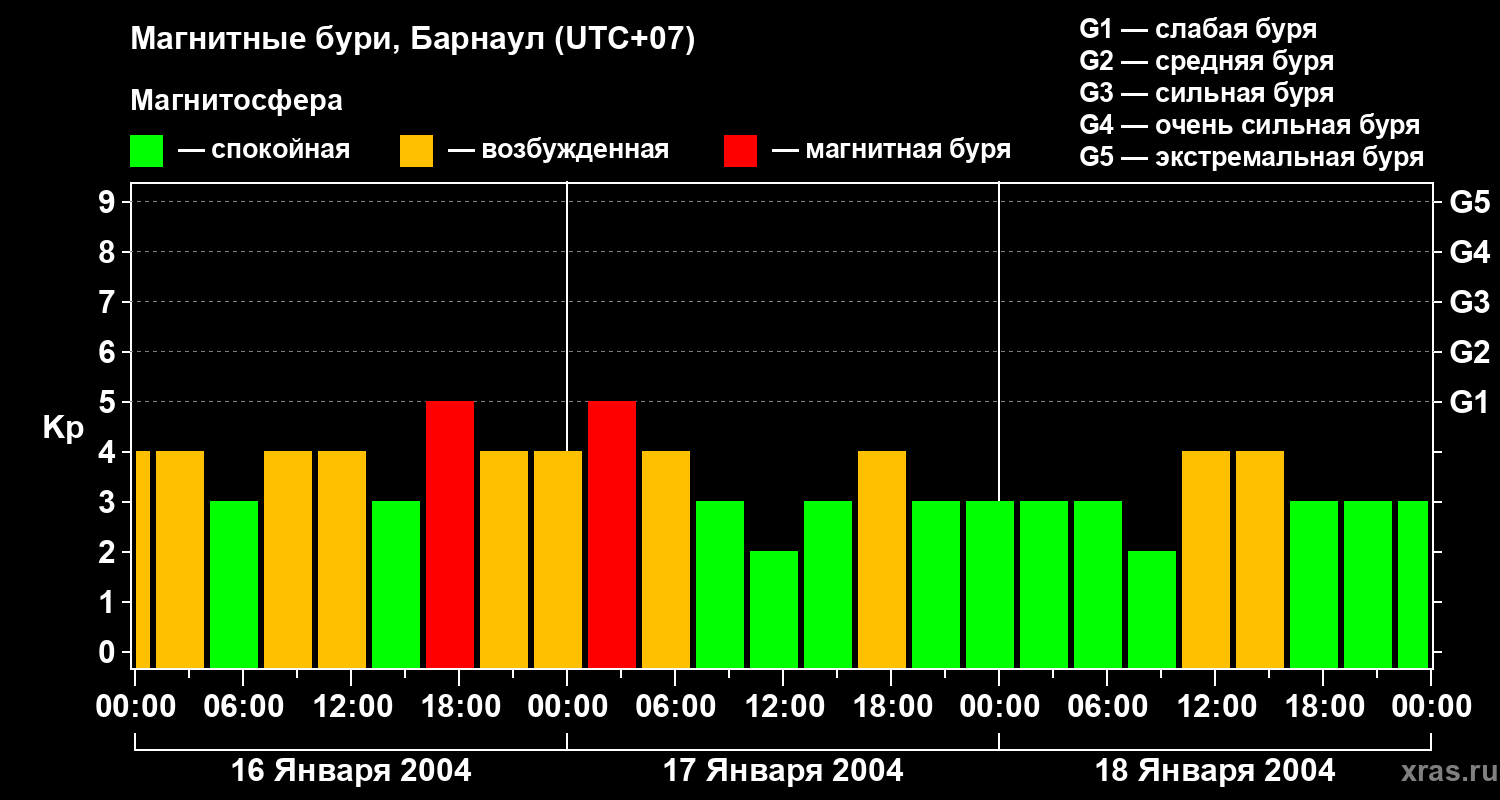 Изменения геомагнитного индекса Kp с 16 по 18 января 2004 года для средних широт