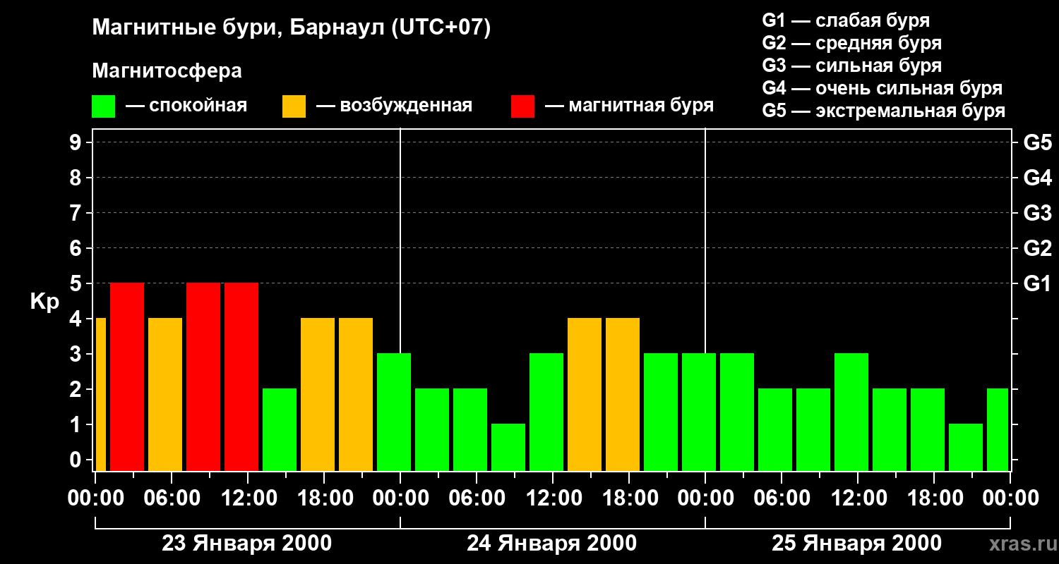 Изменения геомагнитного индекса Kp с 23 по 25 января 2000 года для средних широт