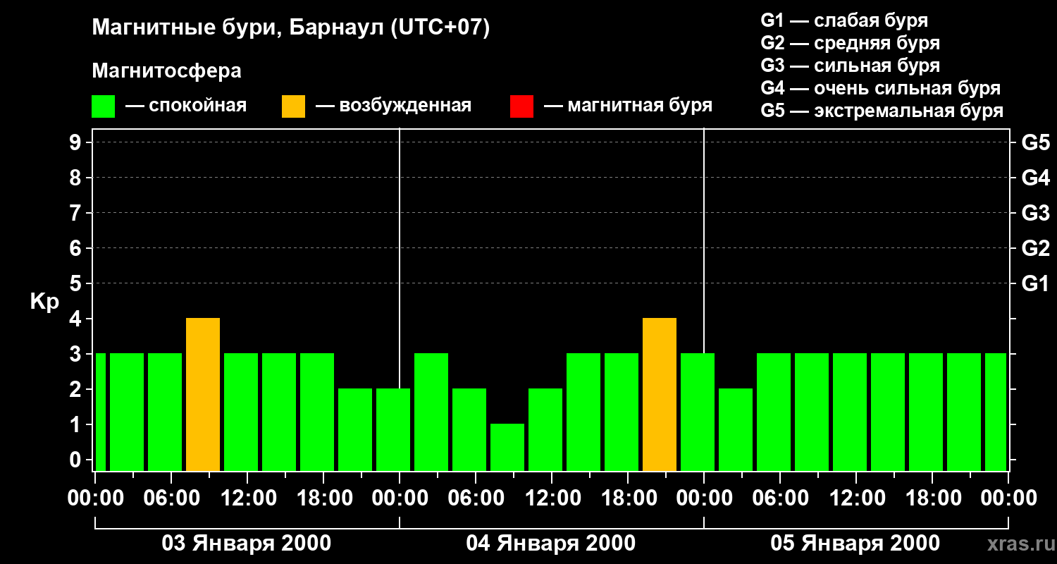 Изменения геомагнитного индекса Kp с 3 по 5 января 2000 года для средних широт