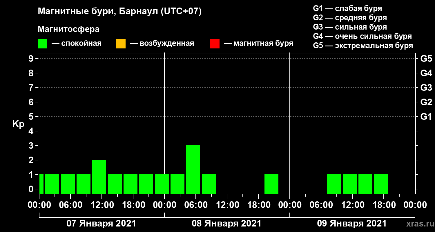Изменения геомагнитного индекса Kp с 7 по 9 января 2021 года для средних широт
