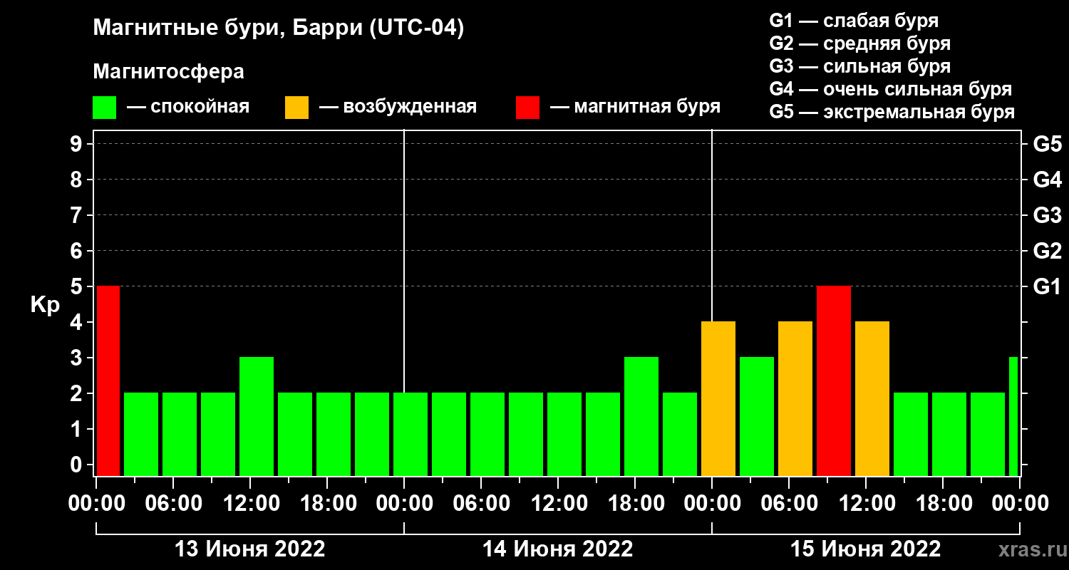 Изменения геомагнитного индекса Kp с 13 по 15 июня 2022 года для средних широт