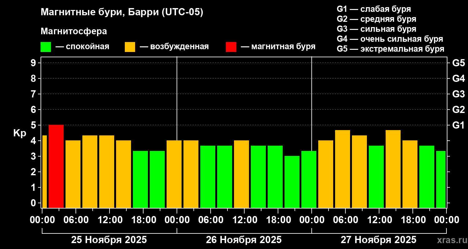 Изменения геомагнитного индекса Kp с 25 по 27 ноября 2025 года для средних широт