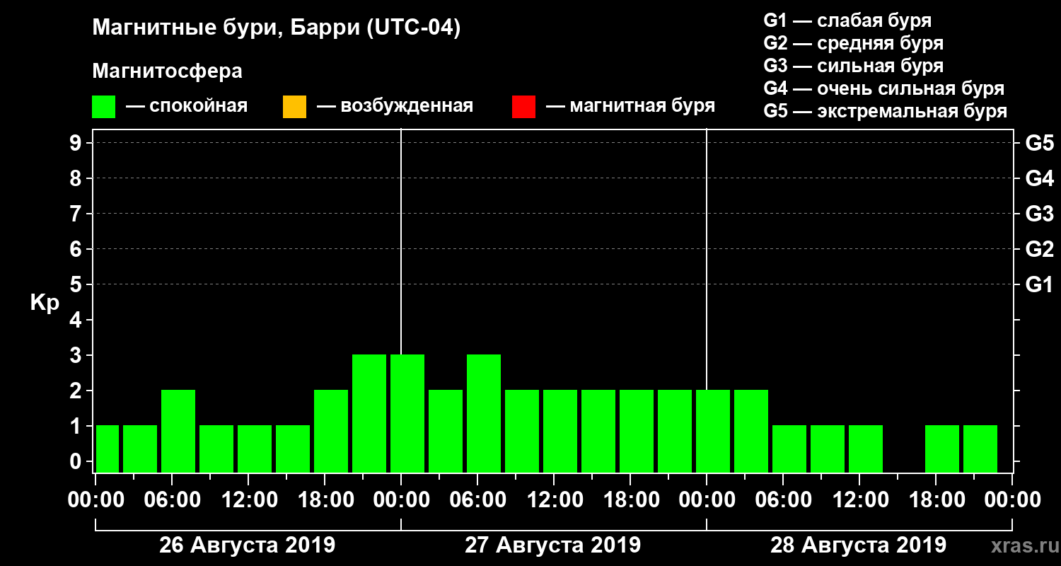 Изменения геомагнитного индекса Kp с 26 по 28 августа 2019 года для средних широт