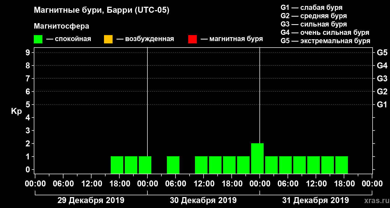 Изменения геомагнитного индекса Kp с 29 по 31 декабря 2019 года для средних широт