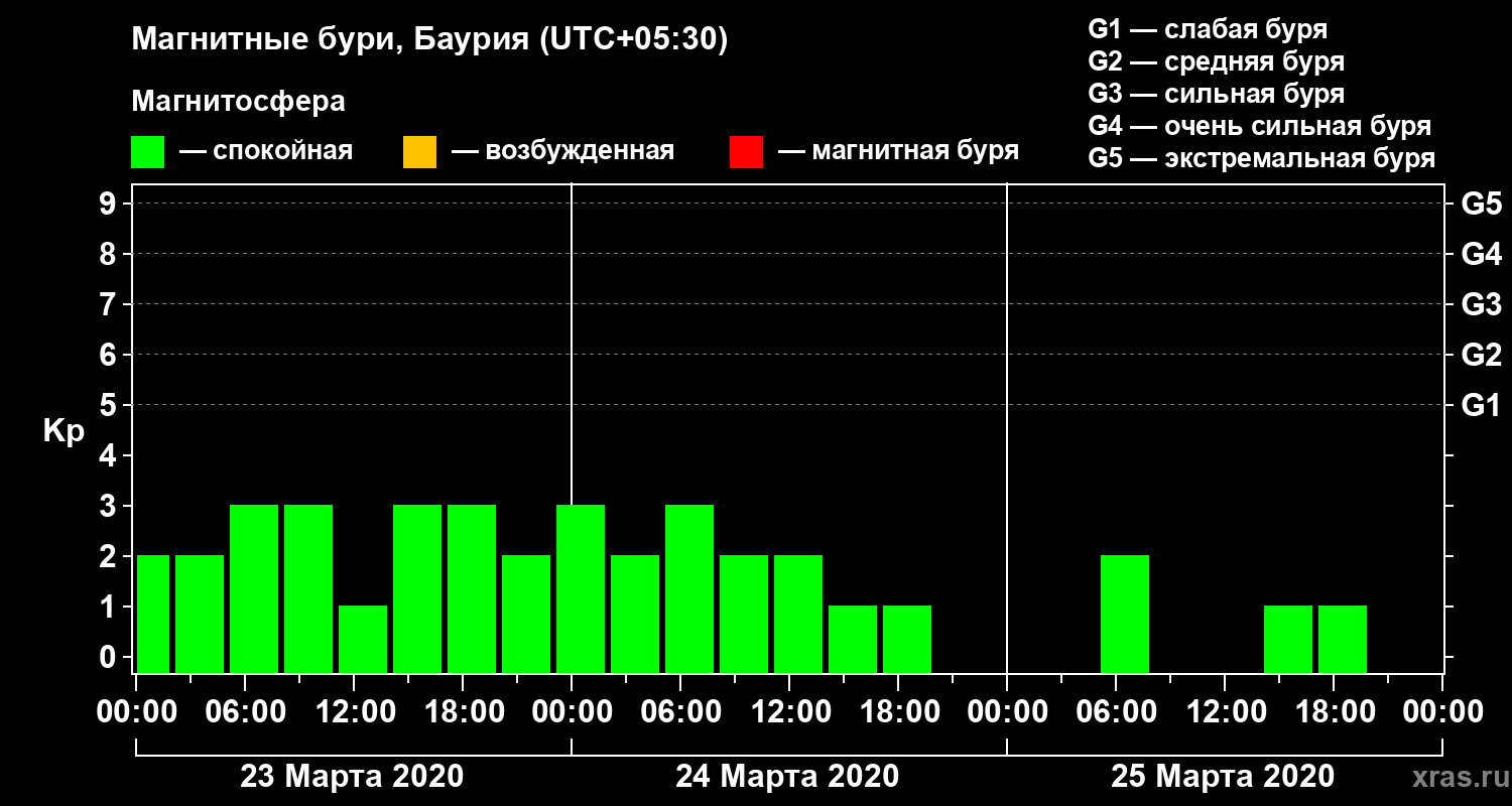 Изменения геомагнитного индекса Kp с 23 по 25 марта 2020 года для средних широт